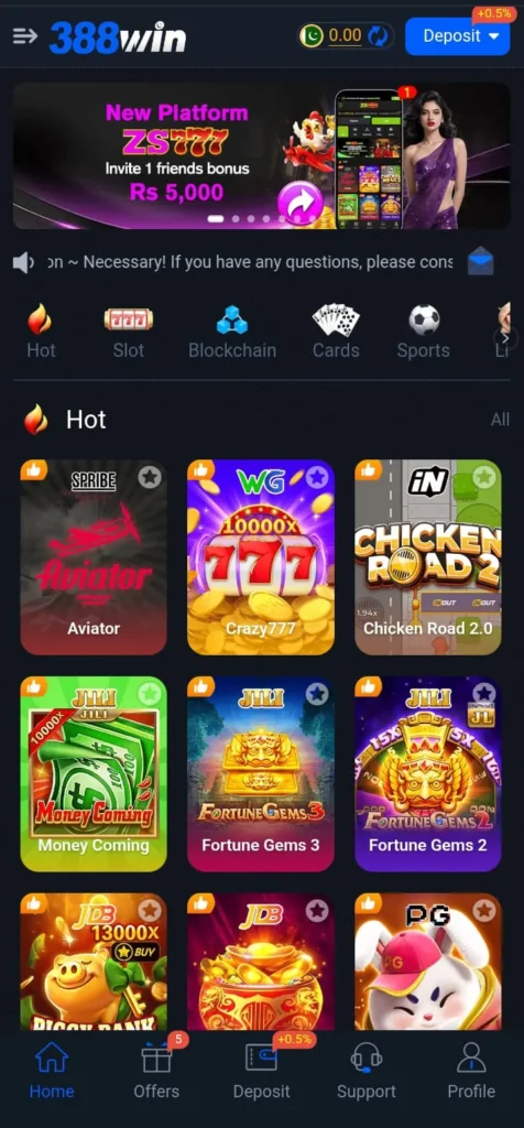 388Win Game is a mobile gaming app for Android that claims to let users play casino-style games and earn real money rewards. It features games like slots, card games, and lottery-style games, where players can try their luck or earn bonuses that can supposedly be withdrawn through local payment methods like JazzCash and EasyPaisa. Also Try This Platform 999R Game Download And Earn Real Money.