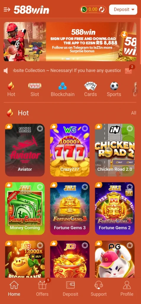 588Win Game is an online gaming and entertainment platform In Pakistan that offers a wide variety of games designed for fun, excitement, and the chance to win rewards. It typically features options such as casino-style games, slot machines, card games, and sometimes sports or number-based betting, all accessible through a digital interface.