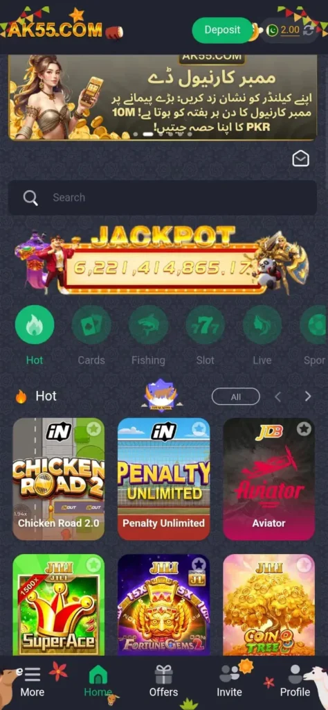 To deposit money in AK55 Game, open the app and log in to your account. Go to the Deposit or Wallet section and choose your preferred payment method, such as JazzCash, EasyPaisa, or bank transfer. Enter the amount you want to add and confirm the transaction. Once the payment is completed, the balance will appear in your gaming account.