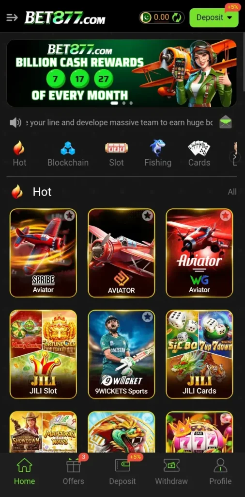 Bet877 usually accepts bank transfers, e-wallets like EasyPaisa, Jazzcash and sometimes cryptocurrencies. The exact options depend on your country and region.